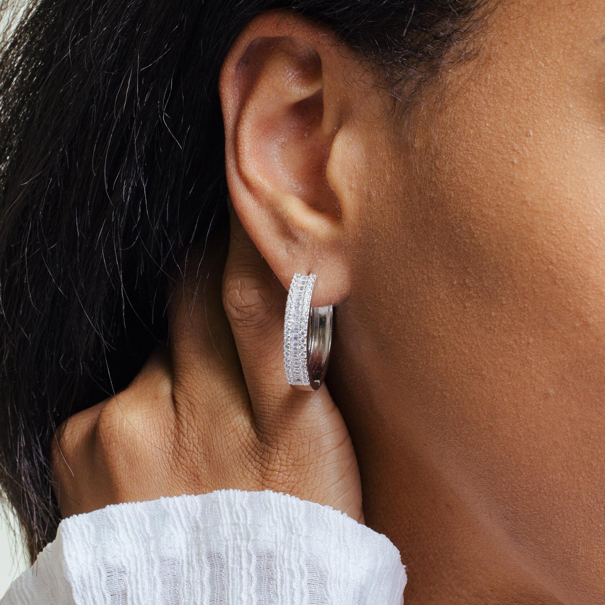 Rhodium Plated 925 Sterling Silver Pave Huggie Hoop 26mmEarrings