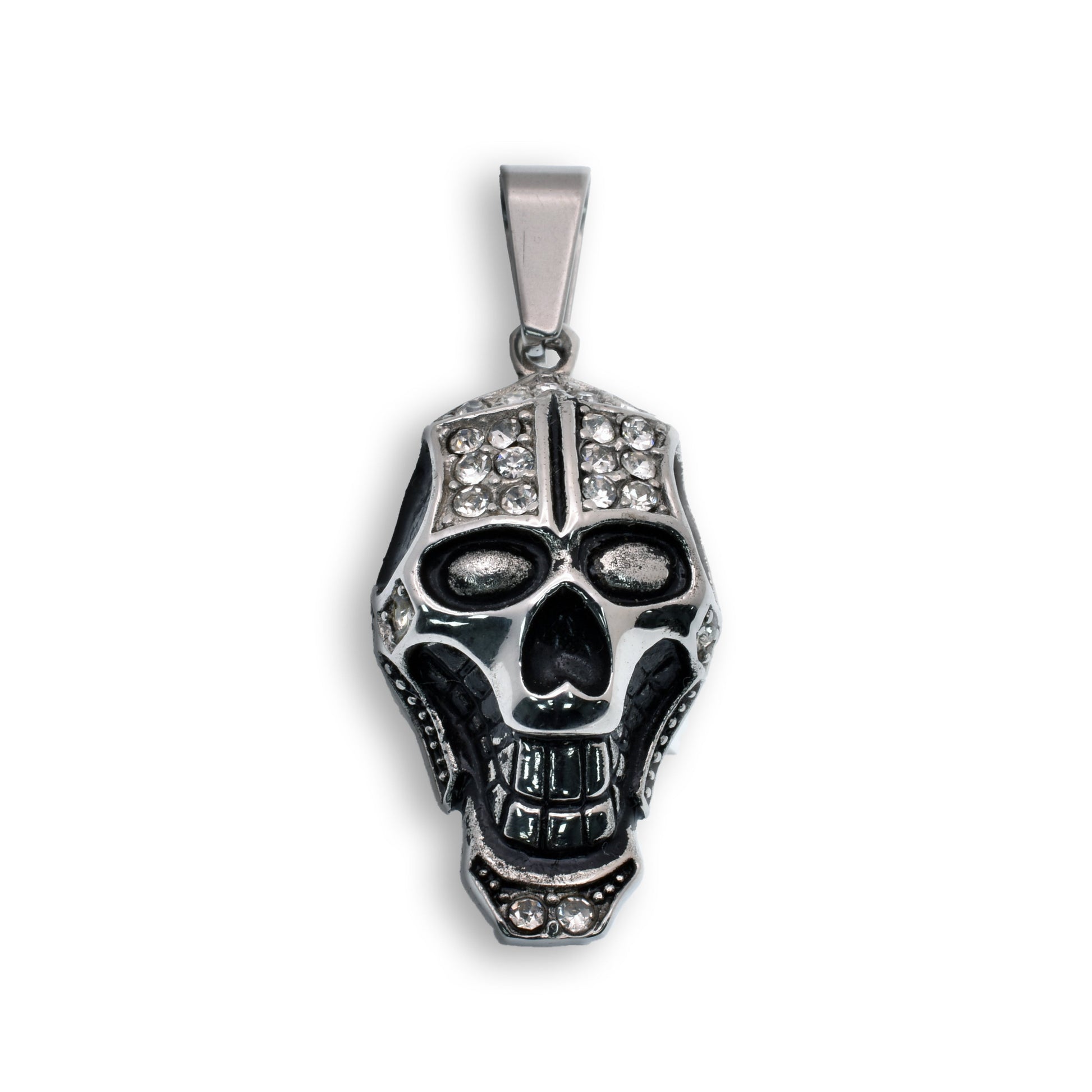 Rhodium Plated Stainless Steel Accented Skull Gothic Biker Clear CZ 17.5mm x 30mm Pendant - SSP00319