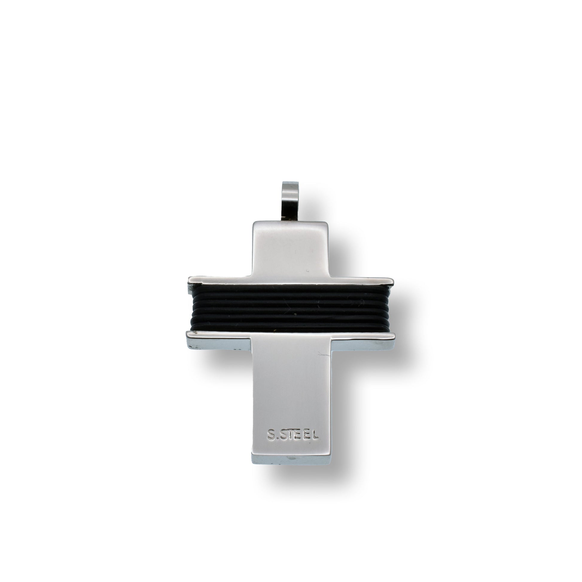 Enhance your style with this luxurious Rhodium Plated Stainless Steel Cross Pendant. Crafted with rubber inserts, this pendant exudes an exclusive, sophisticated look. The rhodium plating adds a touch of elegance and durability, making it a timeless addition to any jewelry collection. Elevate your fashion with this premium pendant.