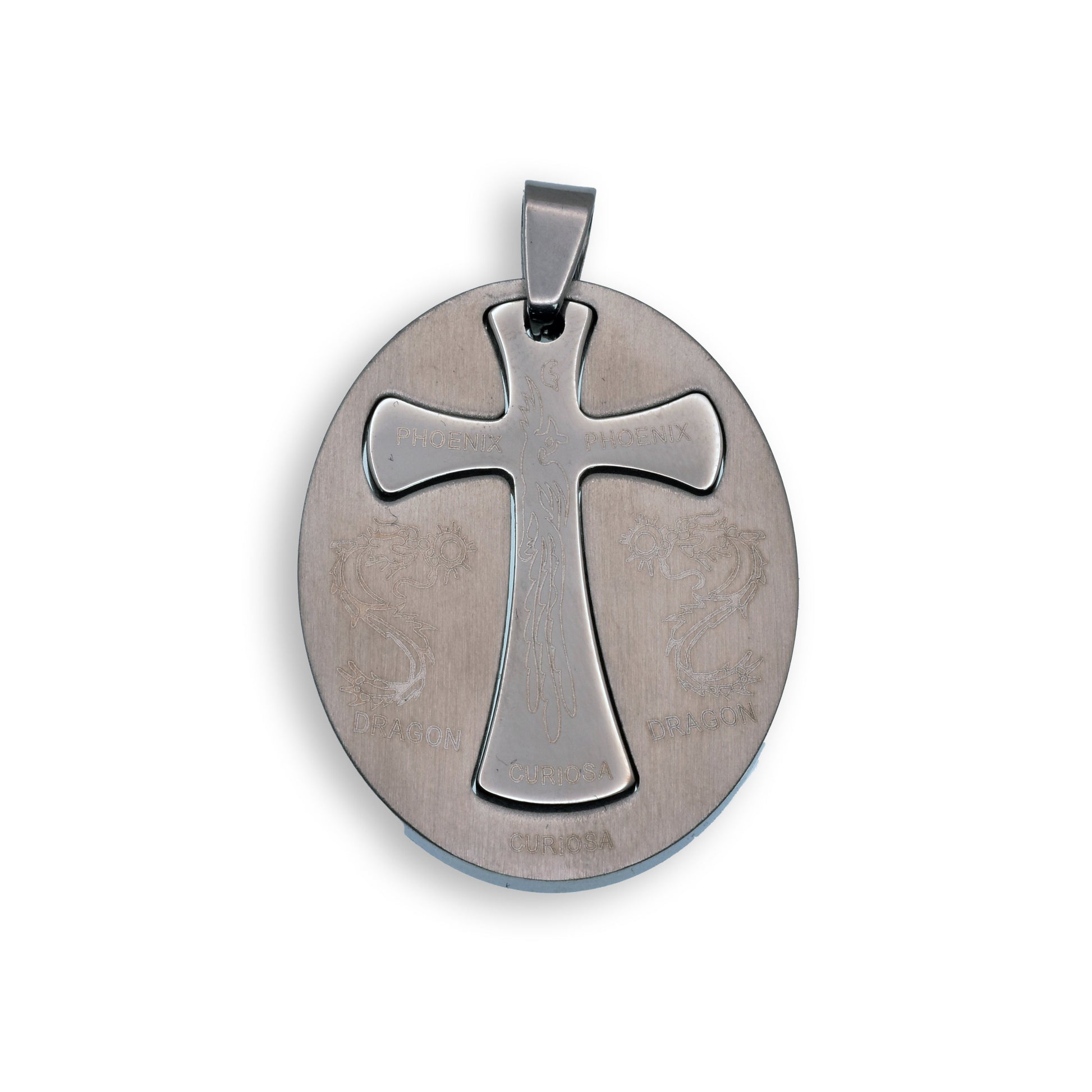 Rhodium Plated Stainless Steel Dragon & Phoenix Cut Out Cross Oval Pendant- SSP00027