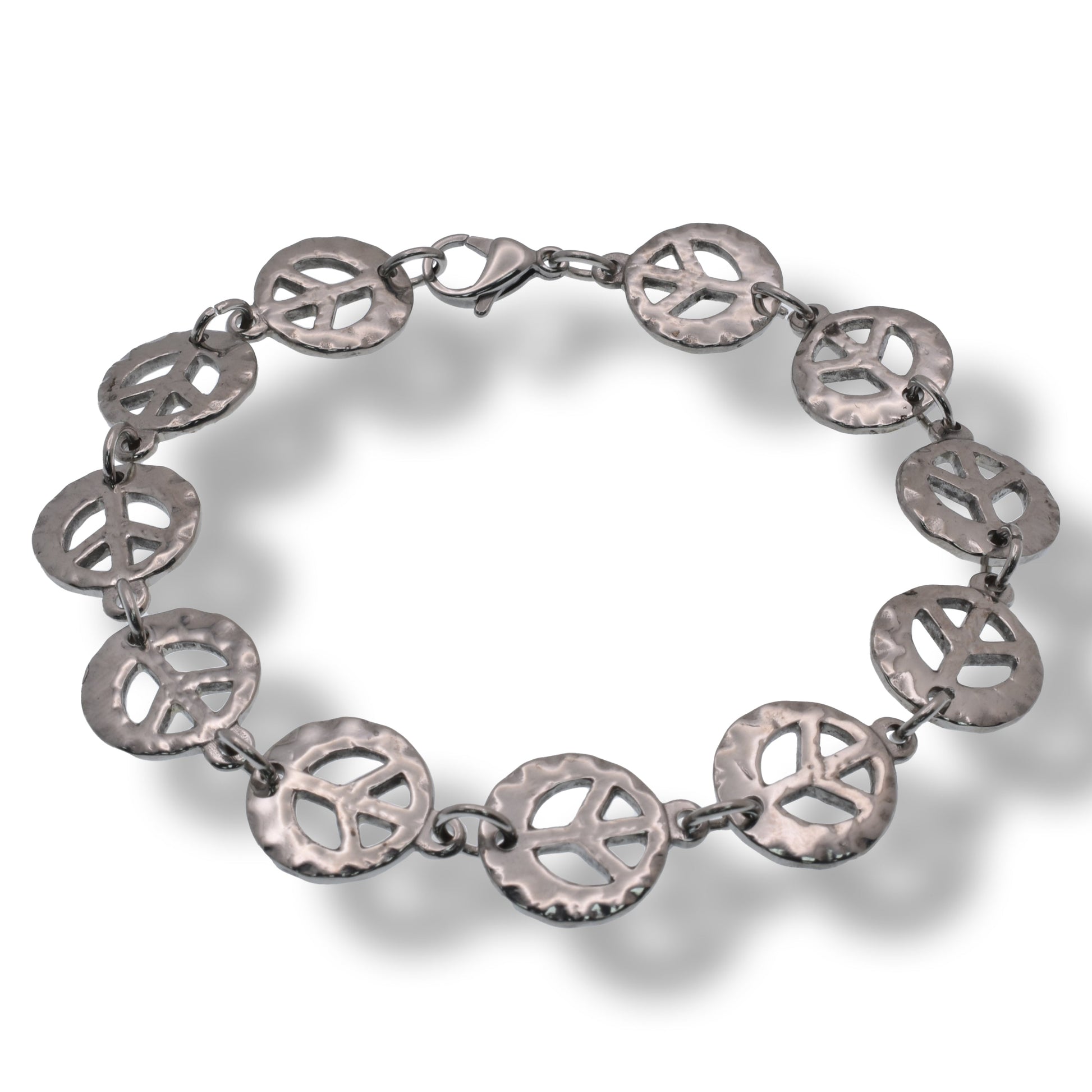 Elevate your style with our Rhodium Plated Stainless Steel Round Peace Sign Bracelet. This sleek and sophisticated piece is crafted from premium materials, ensuring its long-lasting beauty. The peace sign symbolizes harmony and balance, making it a meaningful addition to any outfit. A luxurious must-have for any fashion-forward individual.