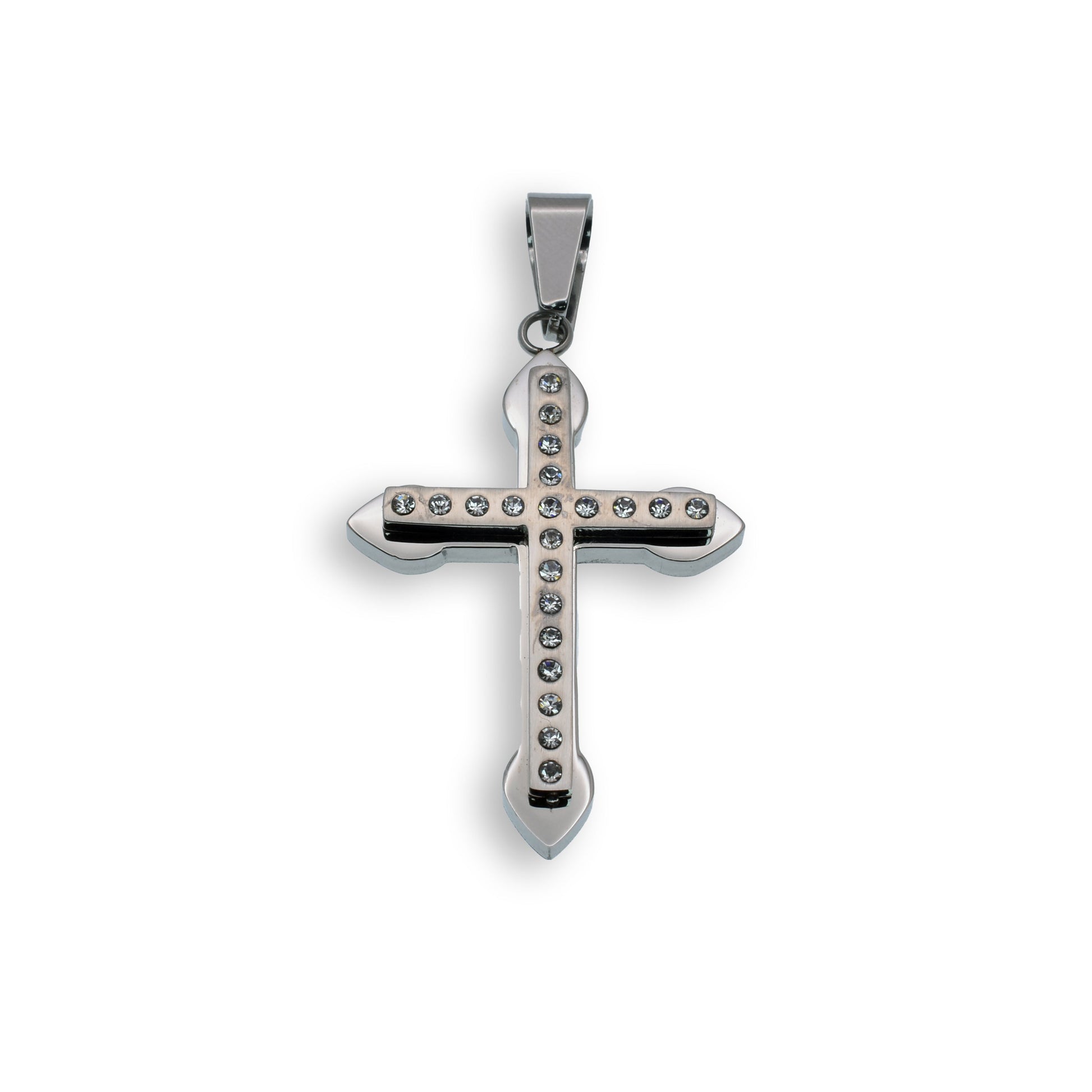 Expertly crafted with rhodium plated stainless steel, this cross pendant features a sleek matte finish and sparkling CZ stones. A durable and stylish addition to any outfit, this pendant exudes sophistication and faith. Elevate your style with this timeless piece.