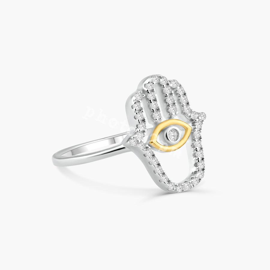 925 Sterling Silver 2 Toned Plated Hamsa Hand Clear CZ Ring - BGR01359