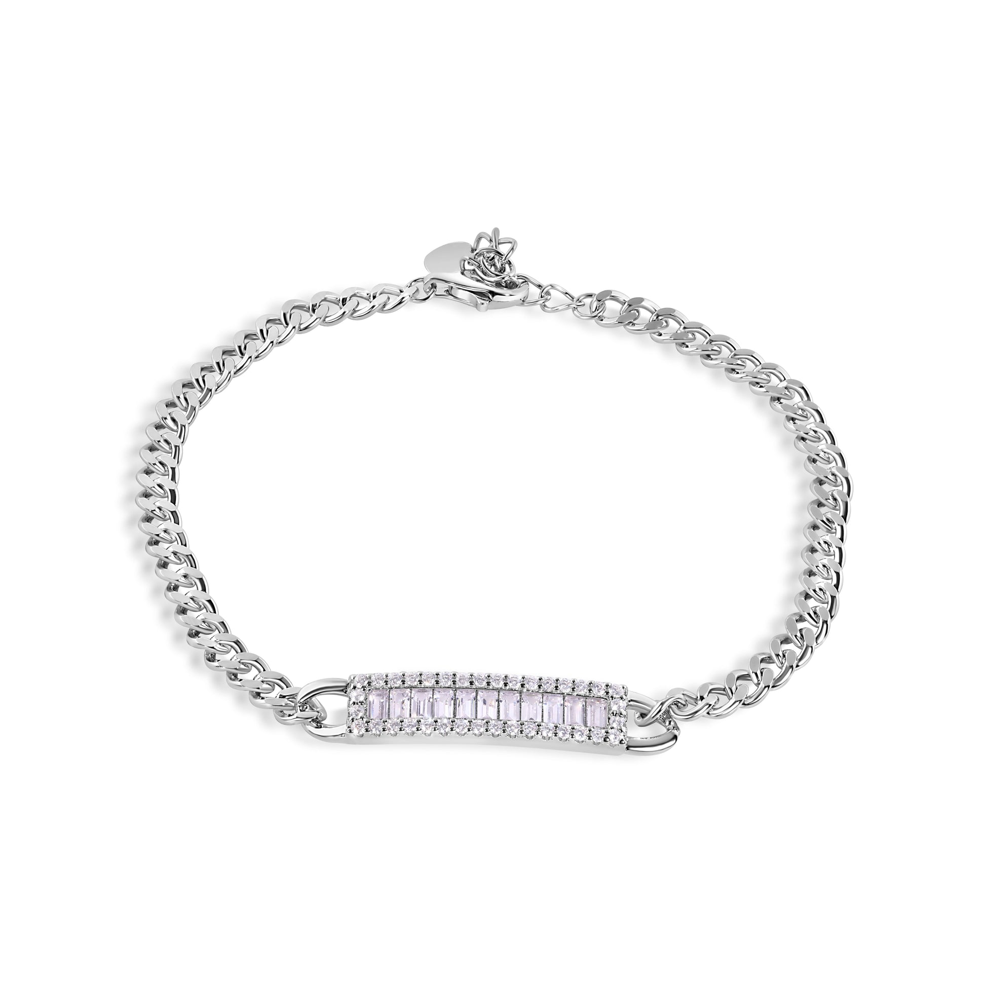 Indulge in a touch of luxury with our Silver 925 Rhodium Plated Bracelet. Crafted with exquisite detail, this adjustable bracelet features a 3.5mm Curb Baguette chain embellished with sparkling clear CZ stones. Elevate any ensemble with this elegant and versatile piece. GMB00142.