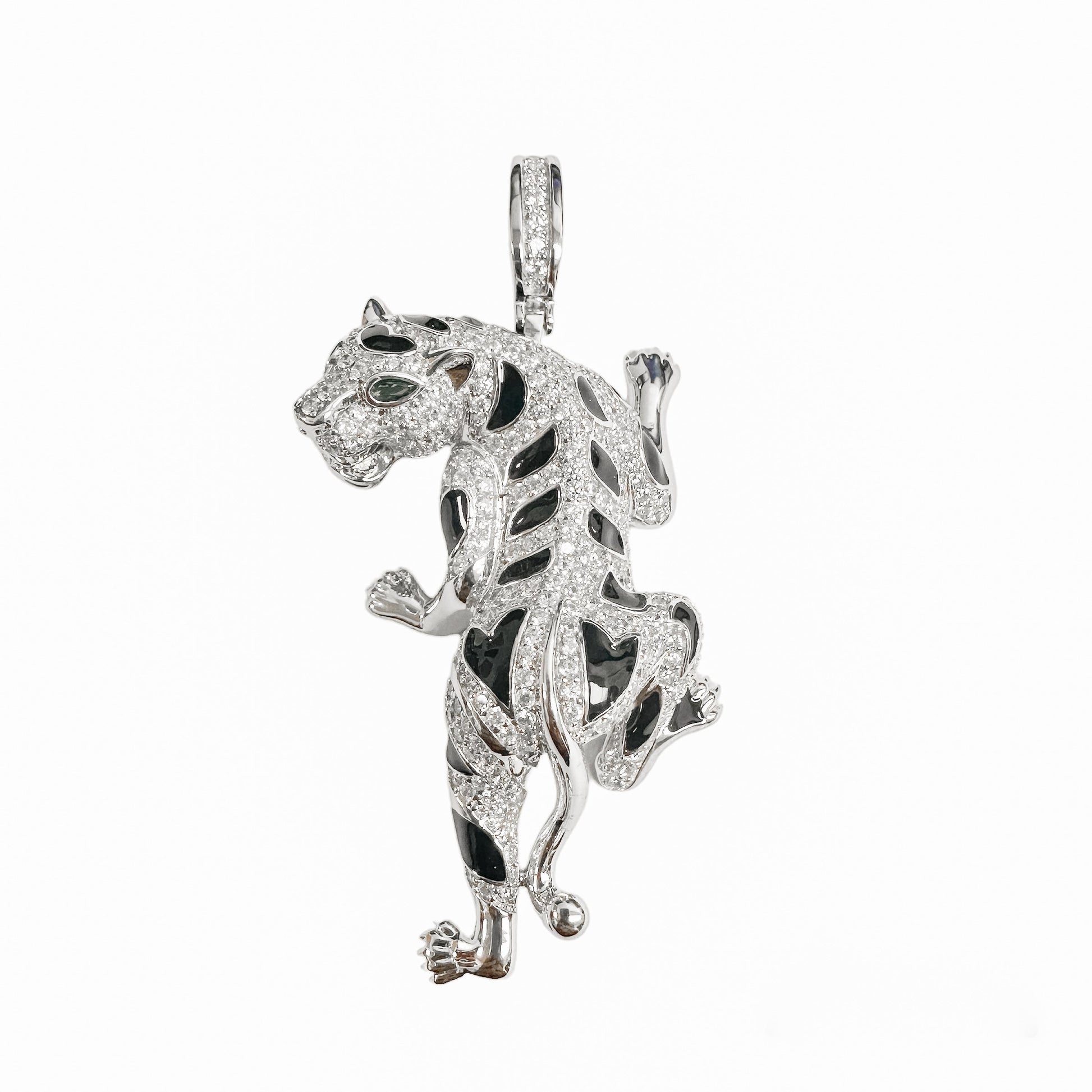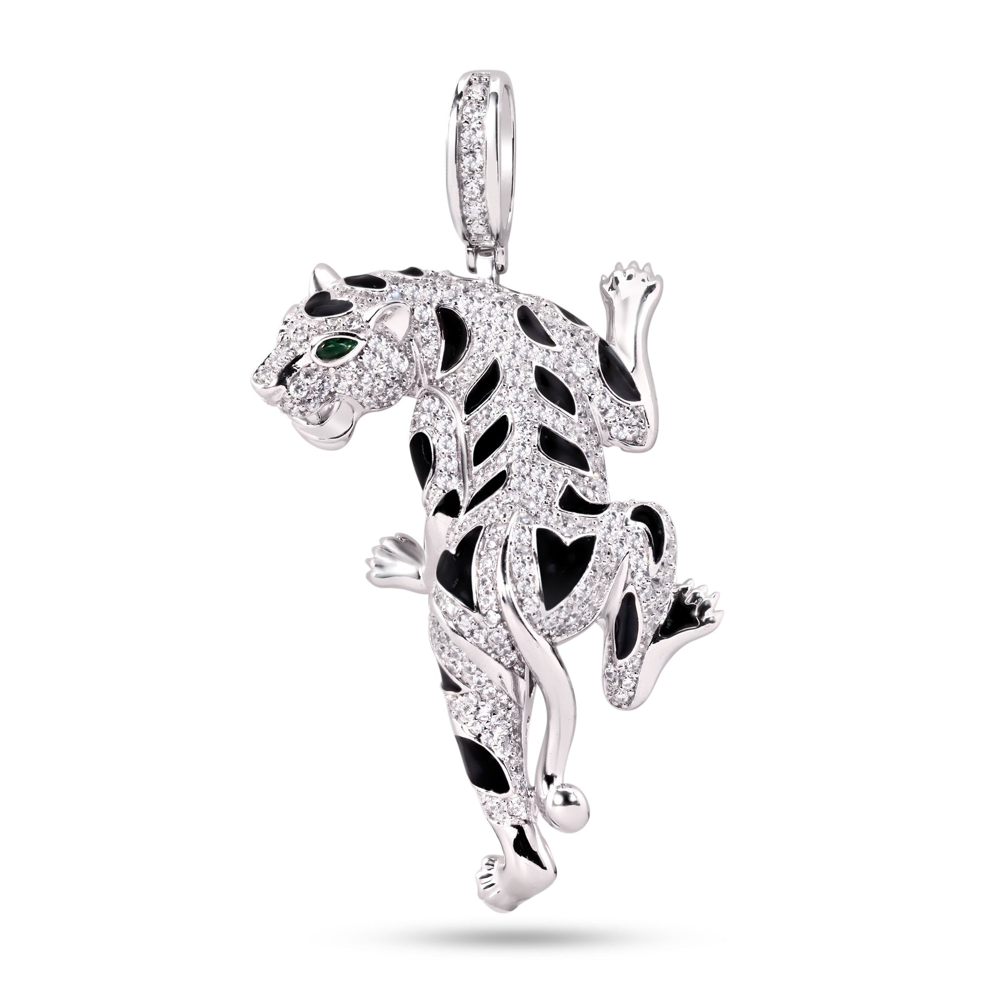 "Unleash your wild side with our Silver 925 Rhodium Plated Cheetah Clear CZ Black Enamel Pendant. Crafted from premium materials, this pendant features a bold cheetah design adorned with clear CZ stones and sleek black enamel. A must-have for those who appreciate luxury and sophistication."