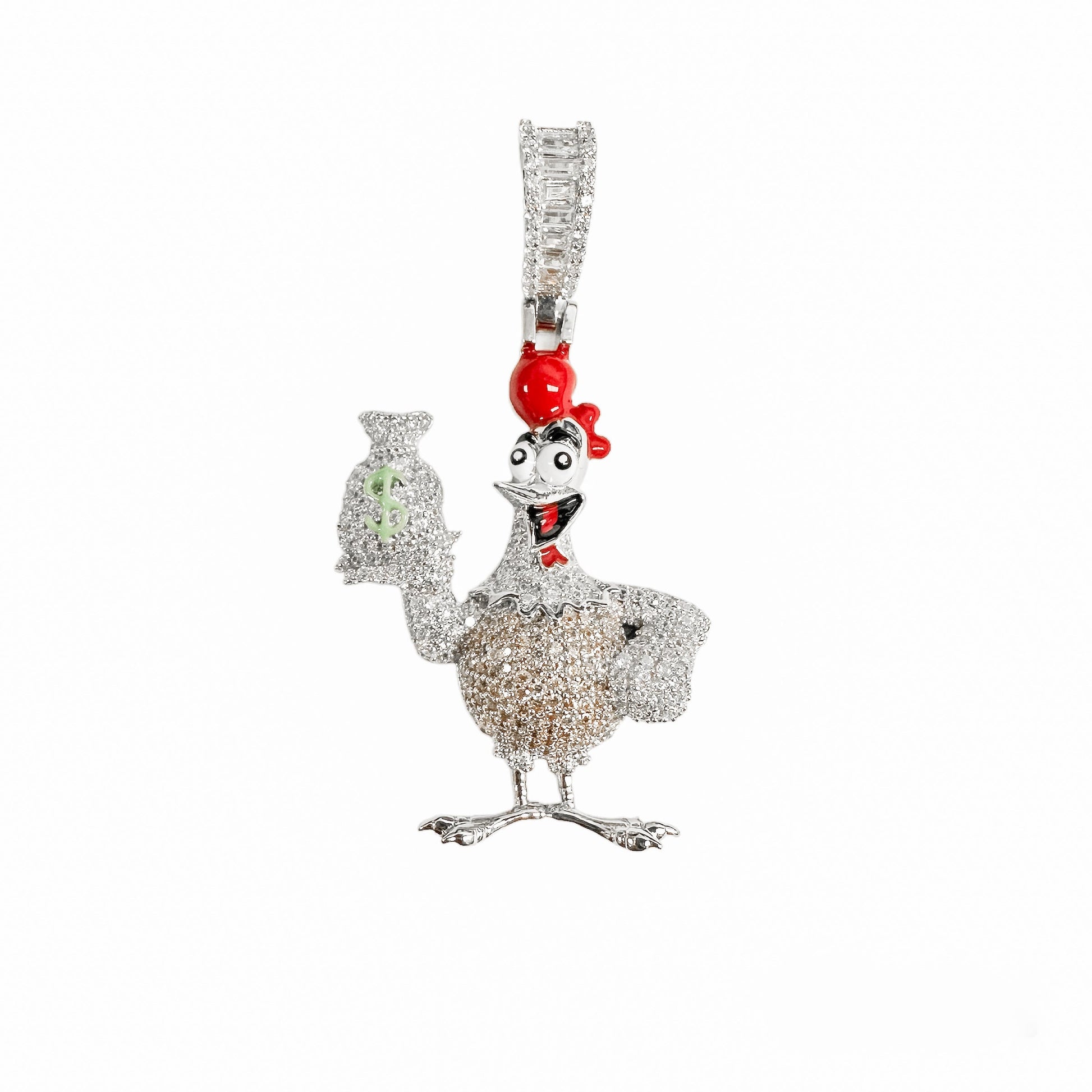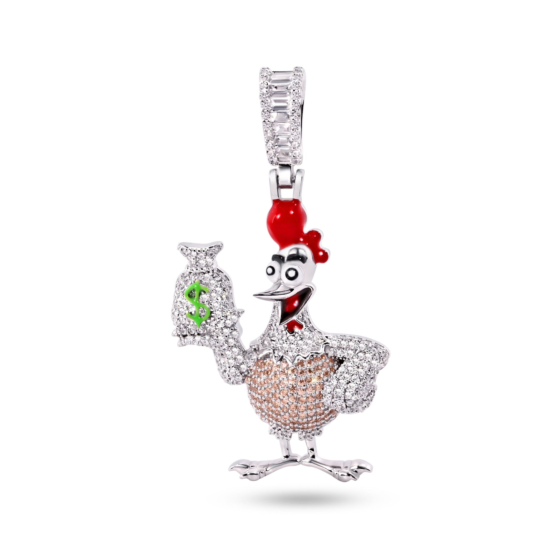 Rhodium Plated 925 Sterling Silver Chicken Money Bag Brown Clear CZ Red and Green Enamel Pendant - SLP00396