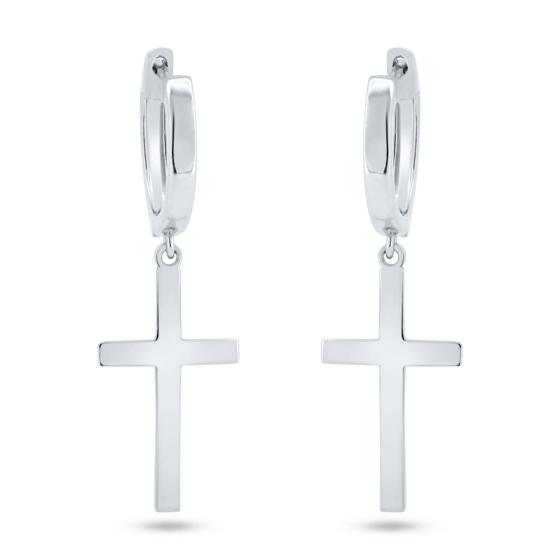 Rhodium Plated 925 Sterling Silver Dangling Cross 13.4mm Hoop Huggie Earrings - GME00146