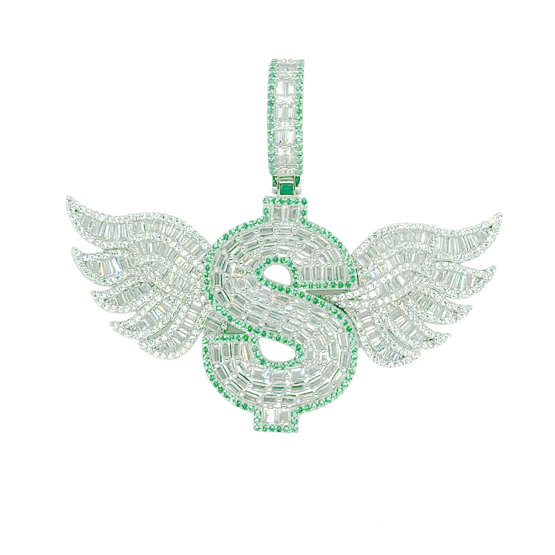 Rhodium Plated 925 Sterling Silver Dollar Sign Wings Baguette Clear and Green CZ Pendant - SLP00426