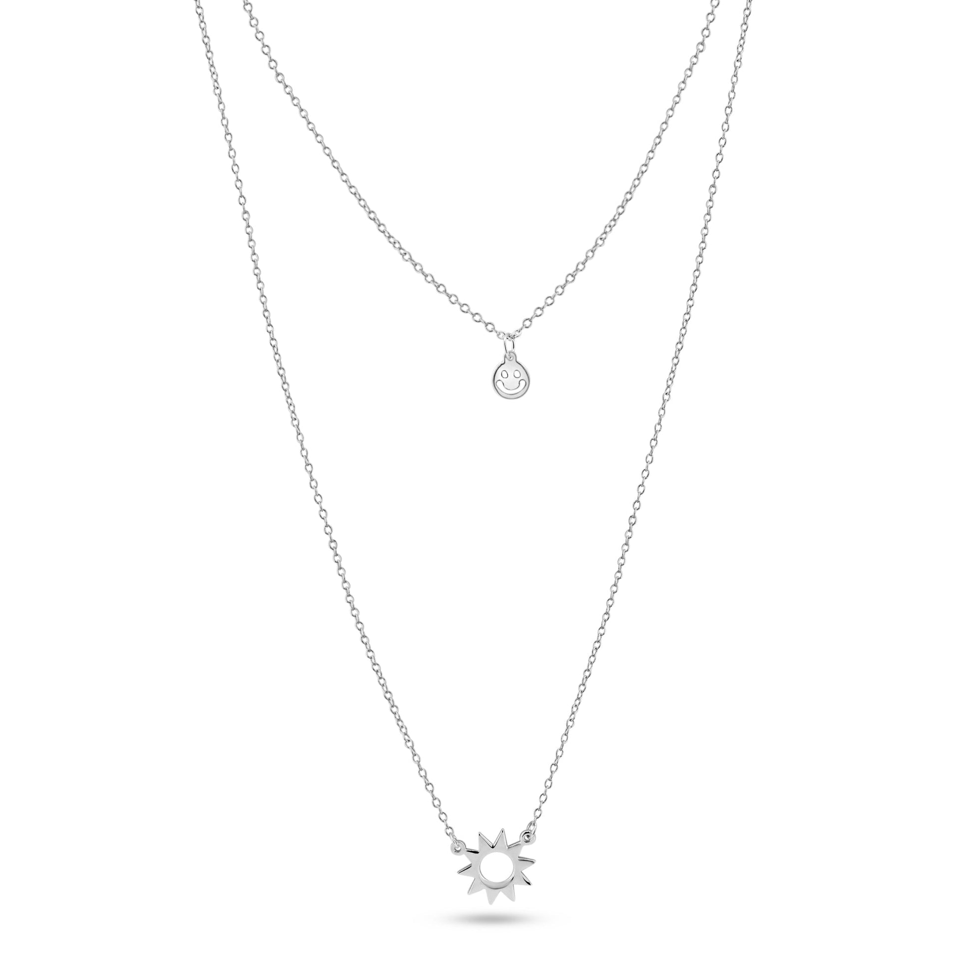 Rhodium Plated 925 Sterling Silver Double Chain Open Sun Smiley Necklace - GMN00201