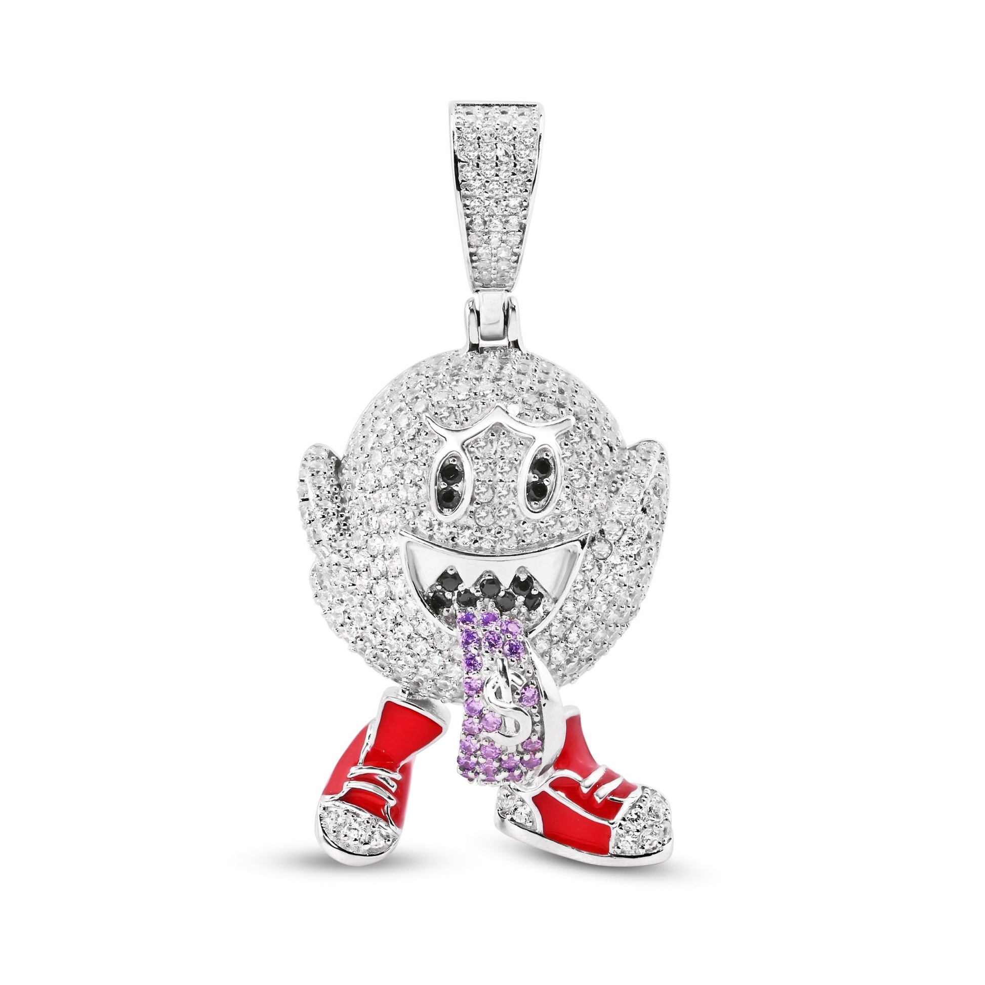 Elevate any look with our luxurious Silver 925 Rhodium Plated Ghost Tounge Out Clear Black and Purple CZ Pendant. Made with high quality materials, this pendant boasts intricate craftsmanship and sparkling CZ stones. Add a touch of sophistication and elegance to your ensemble with this exclusive piece.