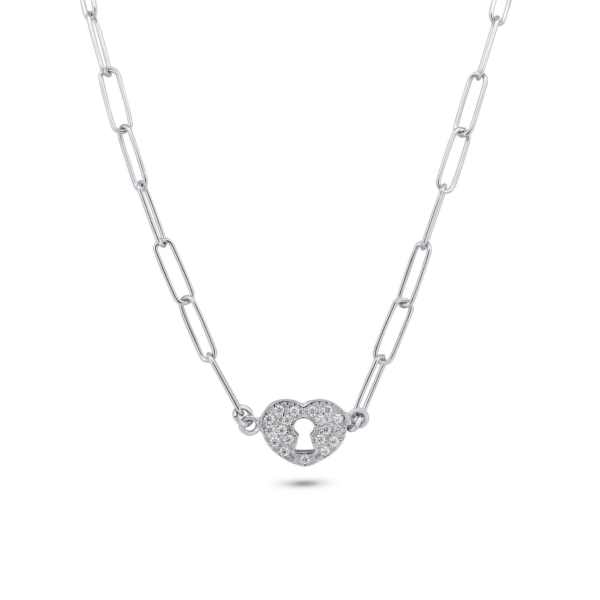 Rhodium Plated 925 Sterling Silver Paperclip Adjustable Clear CZ Heart Lock Necklace - ITN00163-RH
