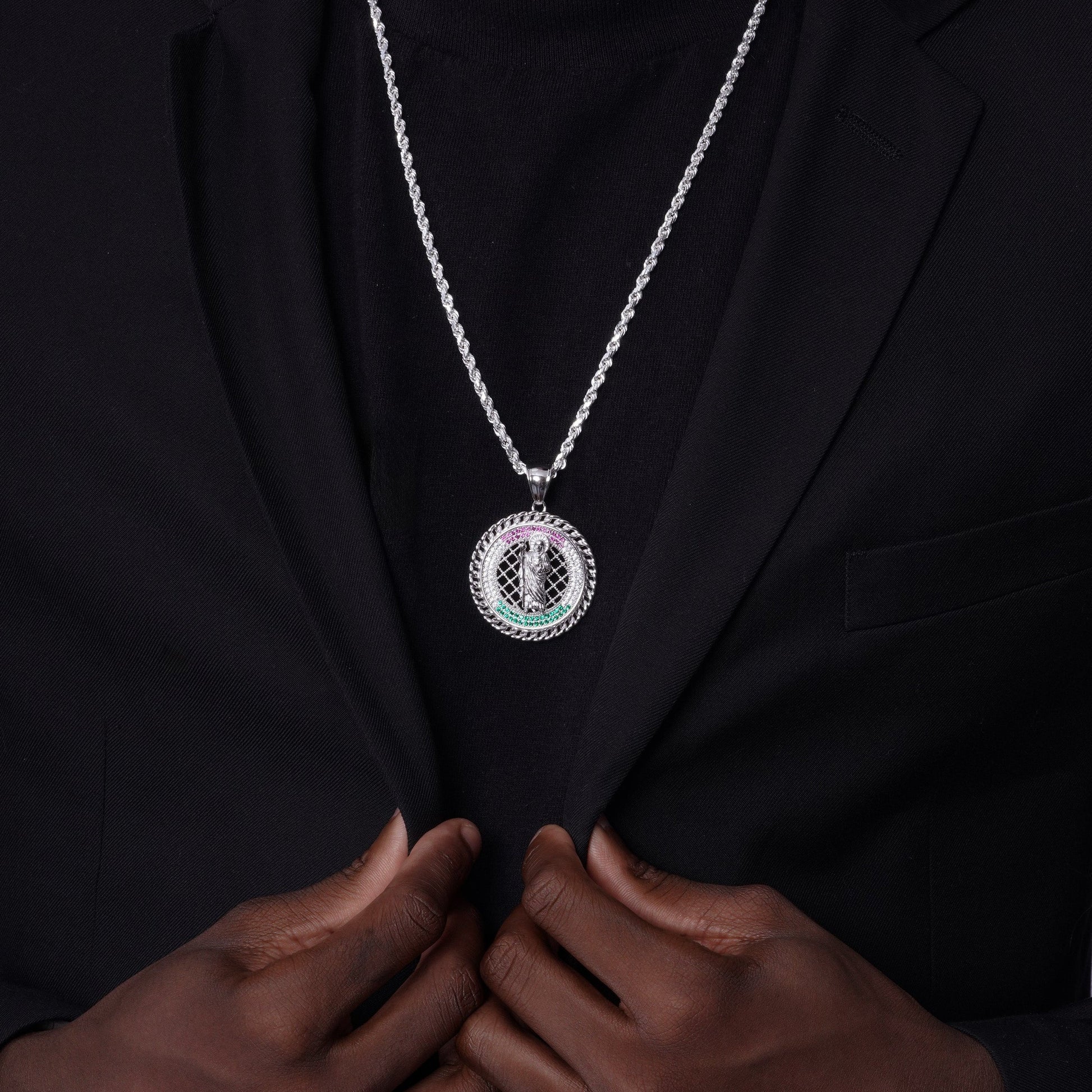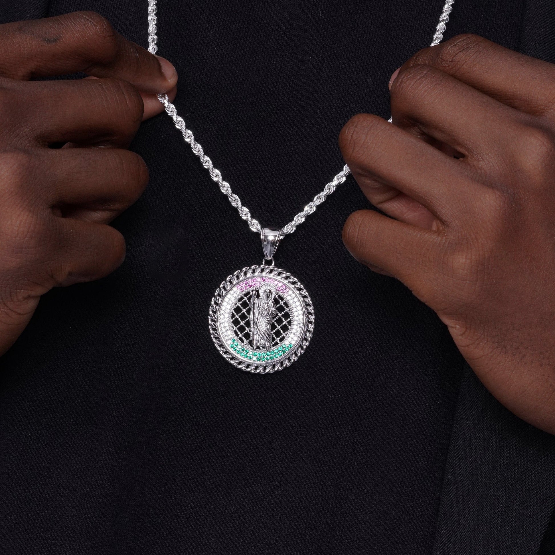 Indulge in luxury with our Silver 925 Rhodium Plated Saint Jude Pendant. Adorned with vibrant green and red CZ stones, this pendant is a testament to elegance and style. The 925 silver and rhodium plating ensure lasting shine, making it a must-have for any fashion-forward individual. Add a touch of sophistication to your jewelry collection with this exquisite pendant.