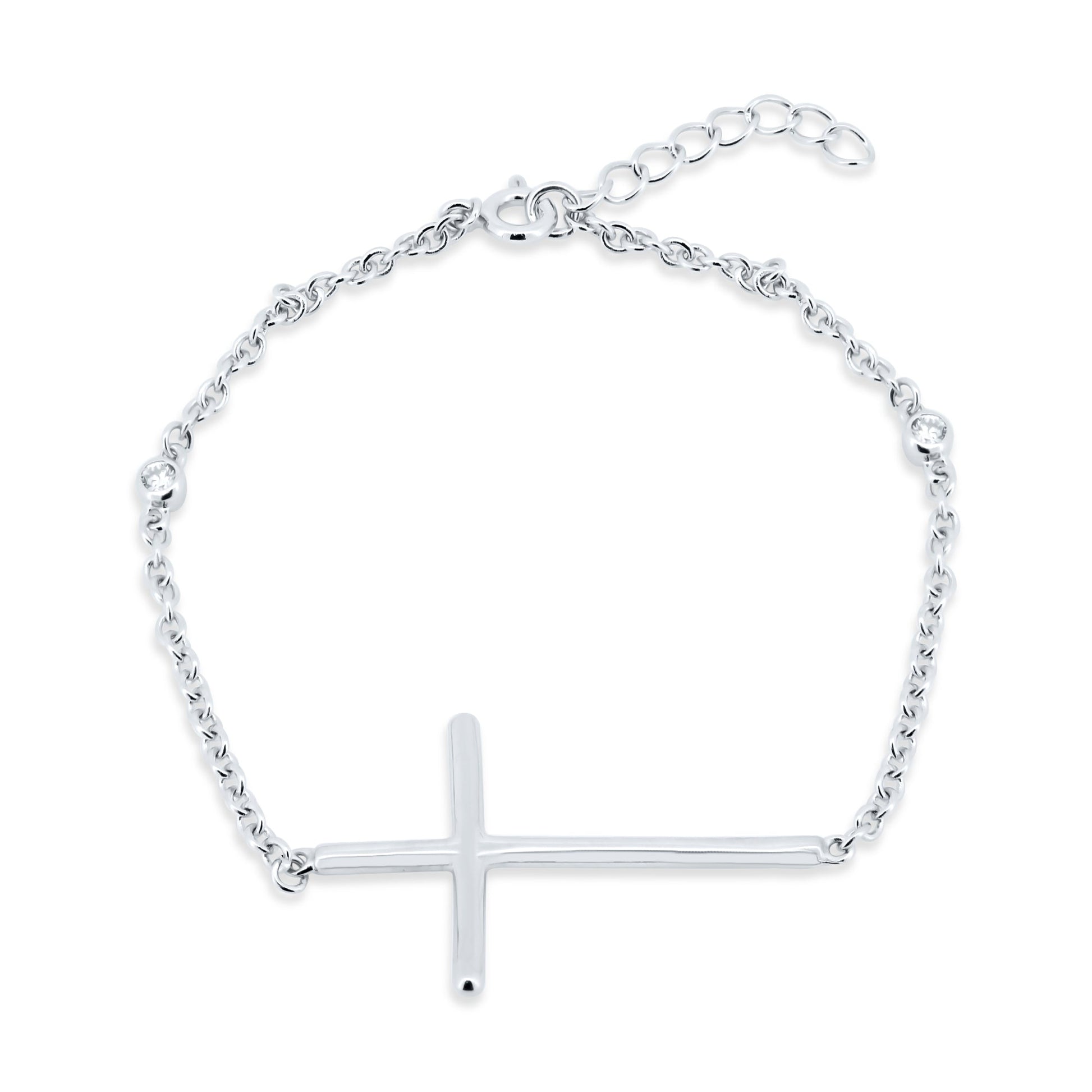 Rhodium Plated 925 Sterling Silver Sideways Cross Bracelet with CZ - BGB00115