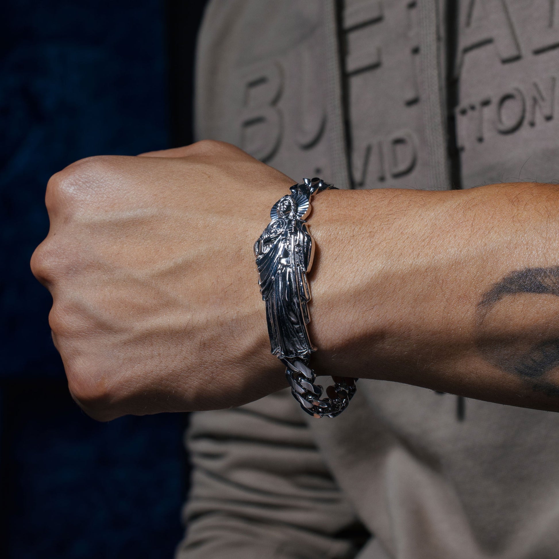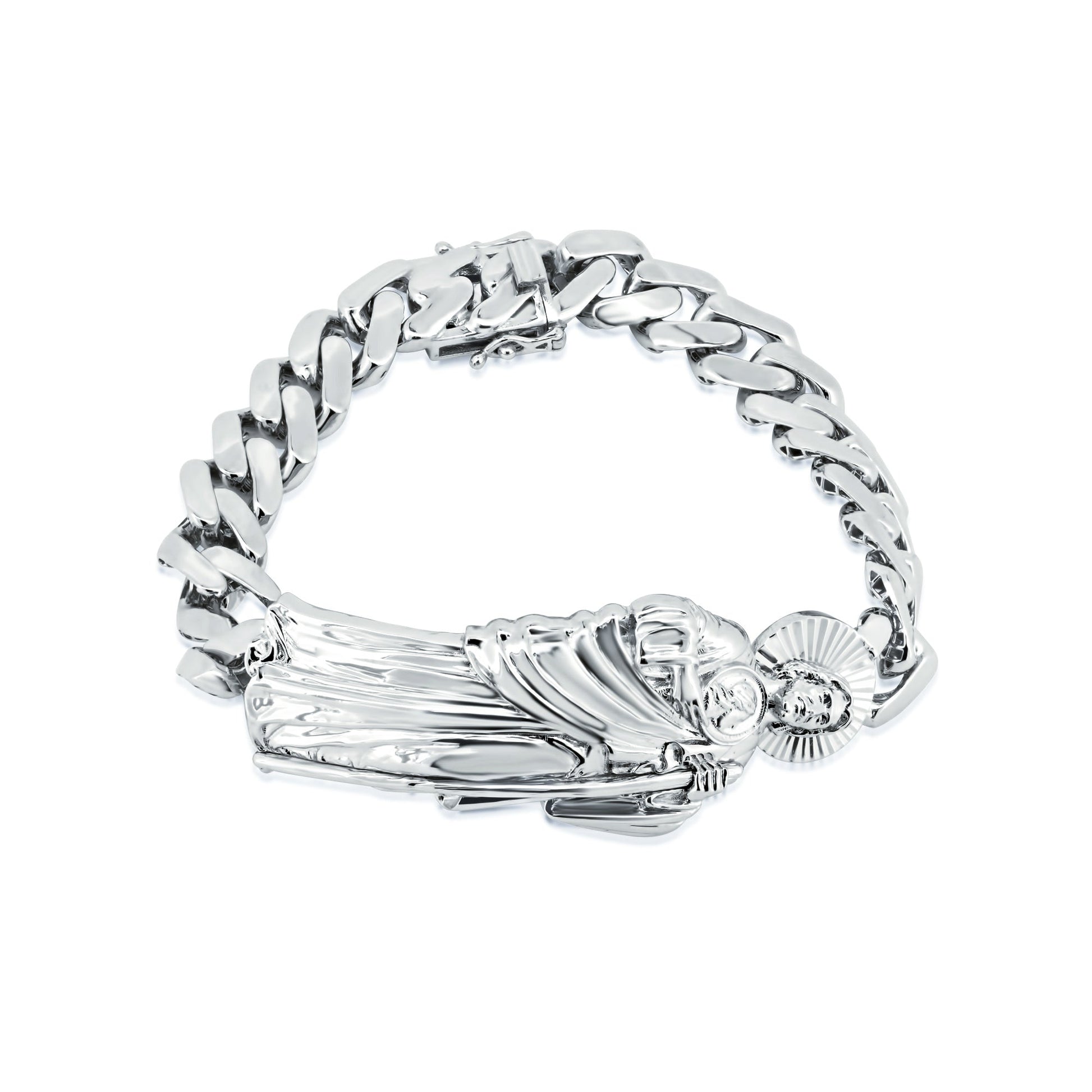 The centerpiece of this bracelet is the St Jude pendant, symbolizing hope and divine intervention. The radiant rhodium plating enhances the pendant's shine, while the intricate detailing adds a touch of elegance. With its classic design and substantial size, this bracelet makes a powerful statement on any wrist.