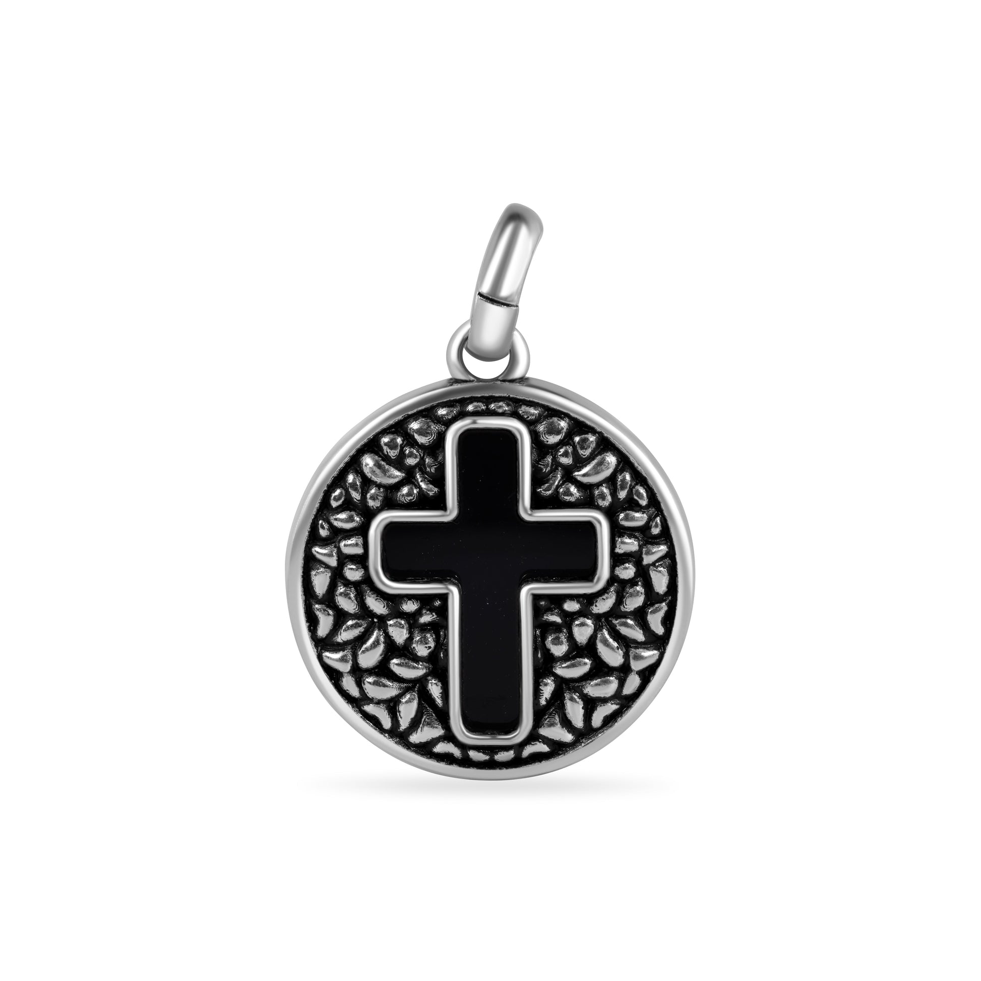 Oxidized 925 Sterling Silver Disc Black Stone Cross Pendant - OXP00005