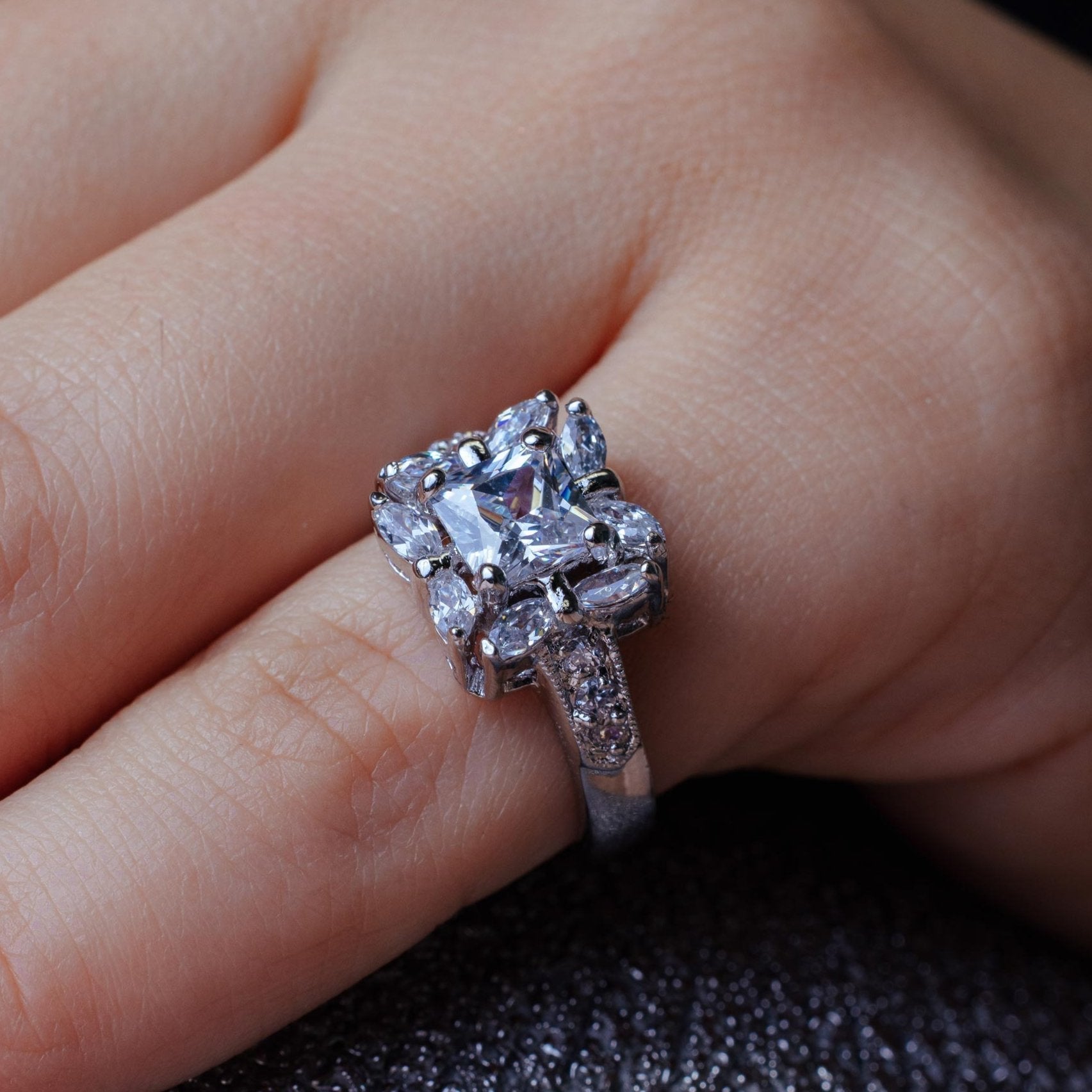 Stone | Center 6mm x 6mm - Side 8 2mm x 3mm marquis and 6 2mm round CZ |