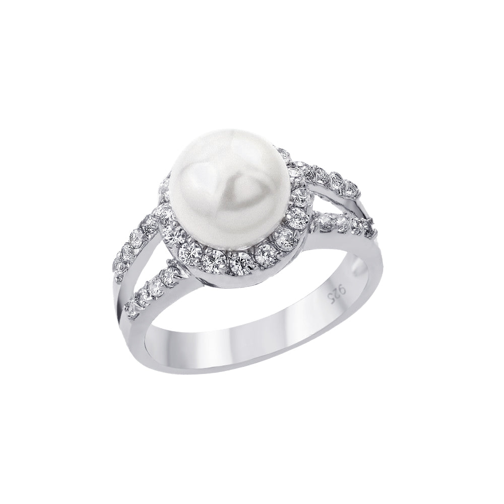 Silver 925 Rhodium Plated Clear Cluster CZ Synthetic Pearl Ring - BGR00878