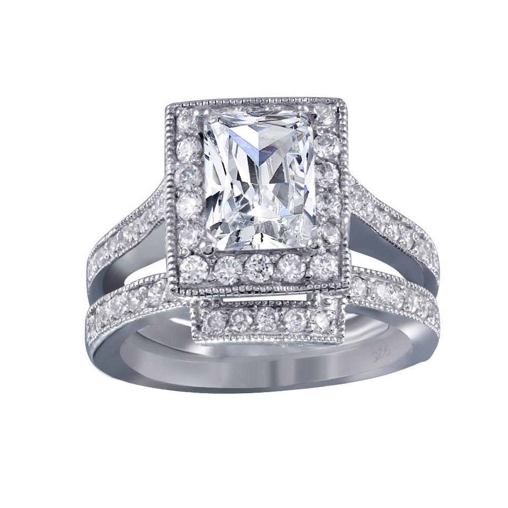 Wholesale Sterling Rhodium Plated 925 Sterling Silver Clear CZ Square Bridal Ring Set