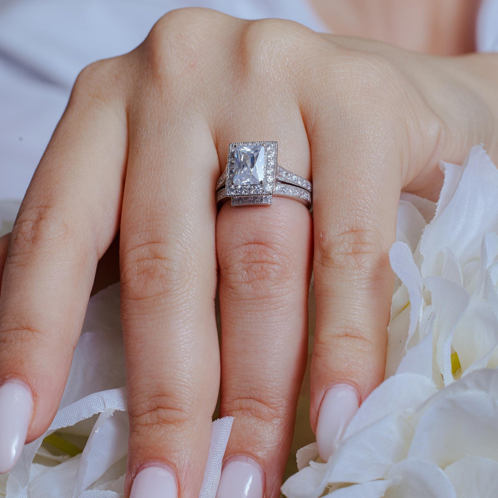 Rhodium Plated 925 Sterling Silver Clear CZ Square Bridal Ring Set - BGR00198