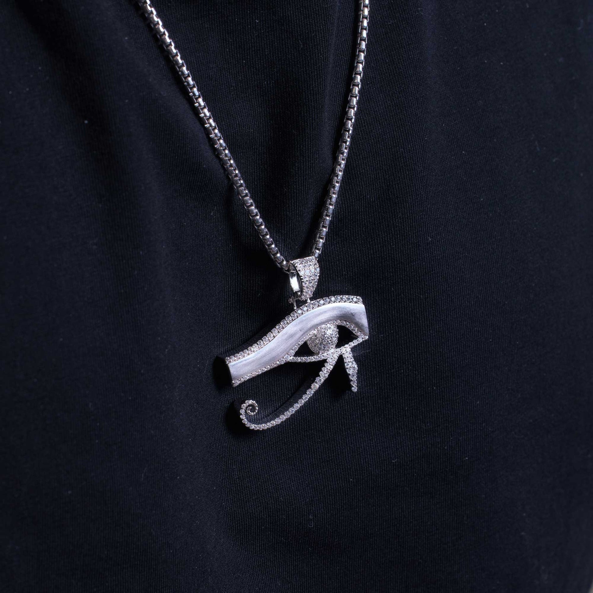Embrace the power of the ancient symbol with our Rhodium Plated 925 Sterling Silver CZ Eye Of Horus Hip Hop Pendant. Crafted with premium materials and dazzling CZ stones, this accessory exudes luxury and elegance. Elevate your style with this exclusive piece, perfect for any art, literature, or fashion lover.
