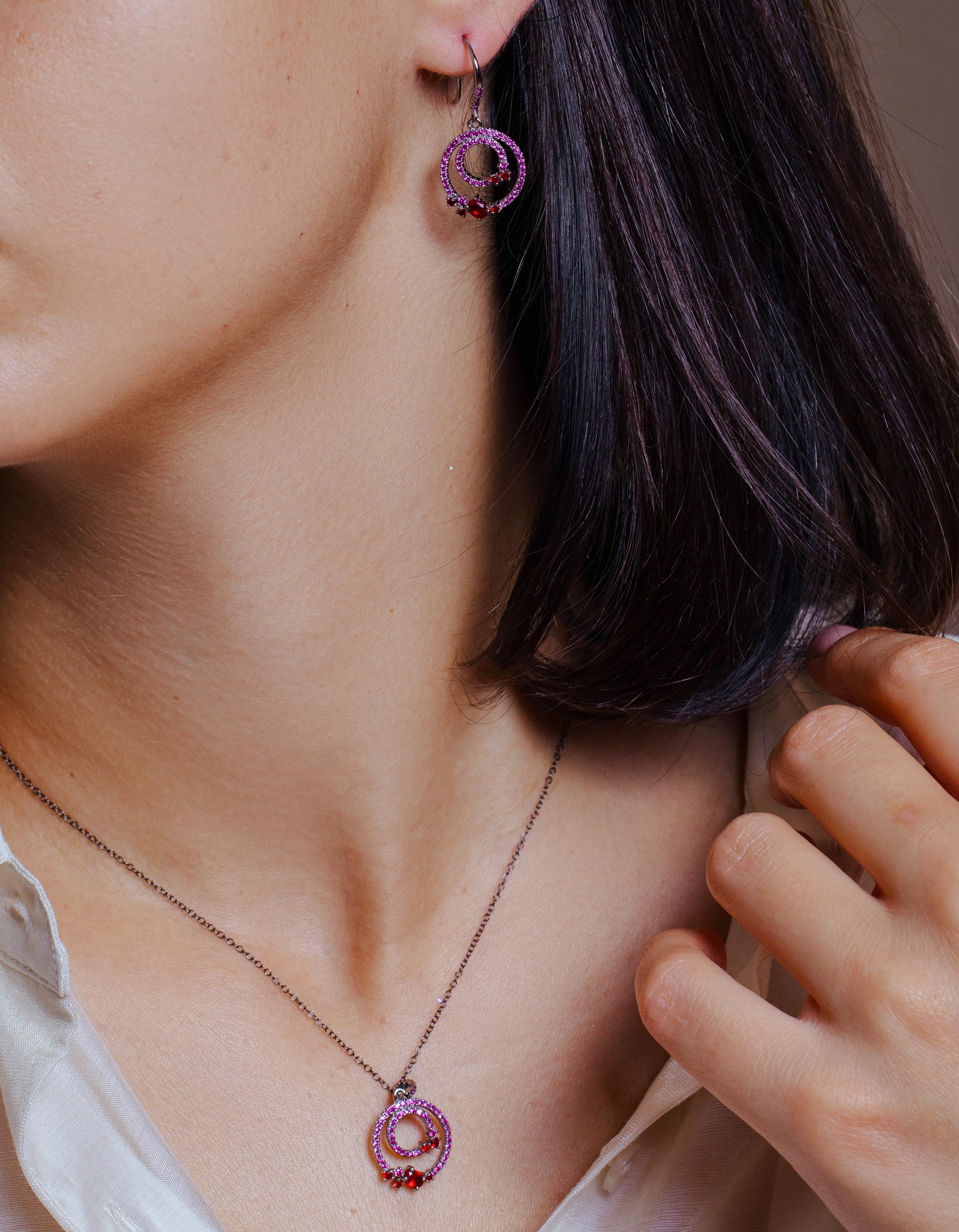 Wholesale Sterling Silver 925 Rhodium Plated Double Circle Earrings and Necklace Set with Red CZ