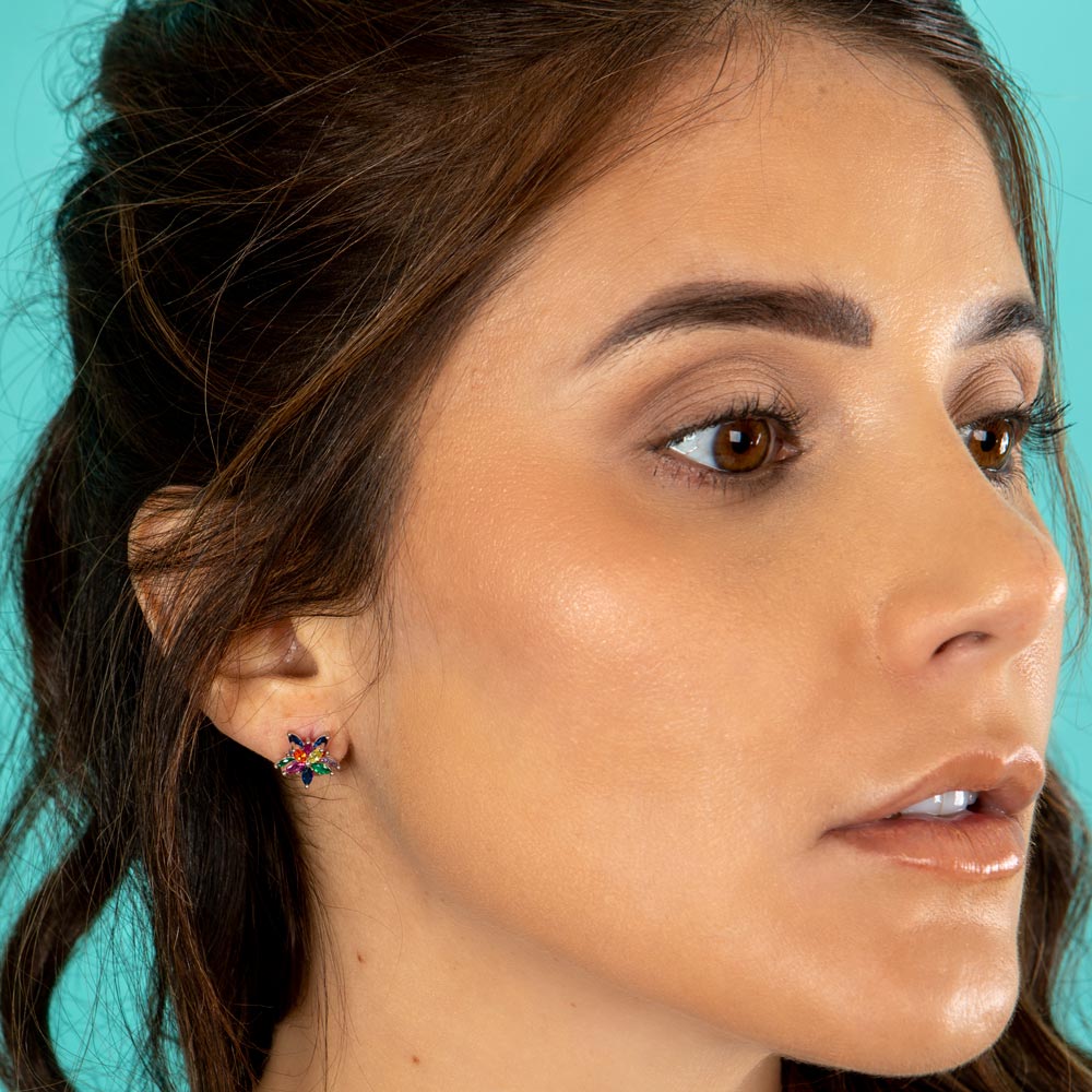 Elevate your look with our Rhodium Plated Sterling Silver Flower Stud Earrings. Each earring boasts a vibrant, multi-colored CZ stone set in a delicate flower design. Crafted with 925 sterling silver and plated with rhodium for added luxury, these earrings are the perfect accessory for any occasion.