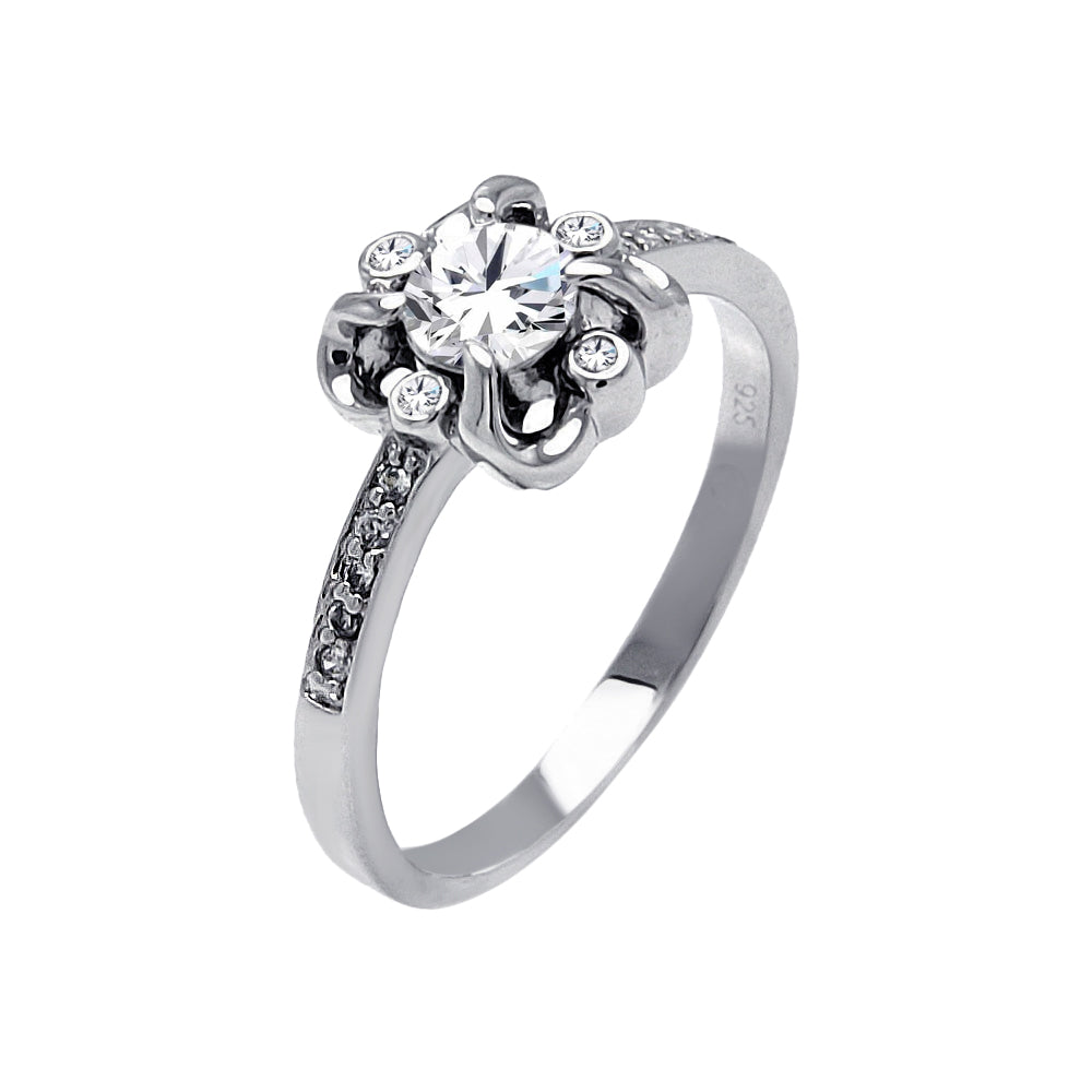 Silver 925 Rhodium Plated Round Clear Center CZ Flower Ring - BGR00478