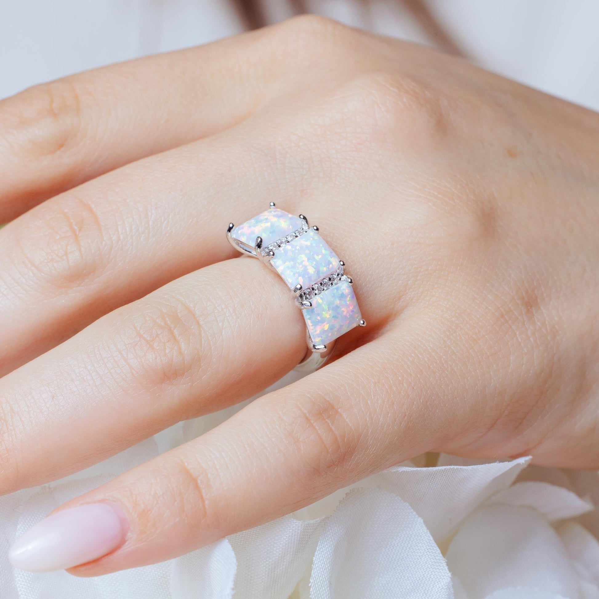 Wholesale Sterling Rhodium Plated 925 Sterling Silver Triple Square Synthetic Opal CZ Ring