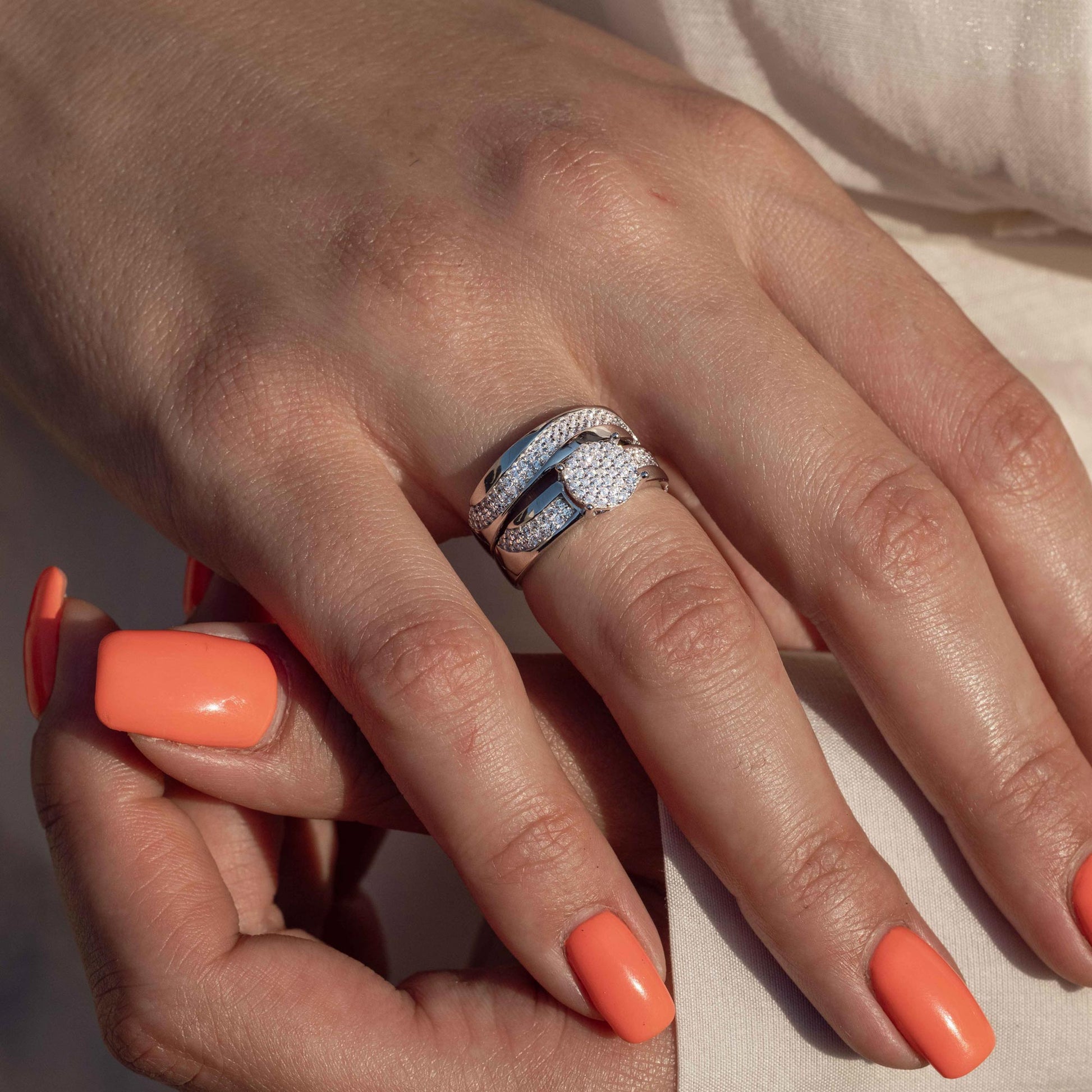 Silver 925 Rhodium Plated Wave CZ Band Round Center Cluster Stones Wedding Ring - GMR00176